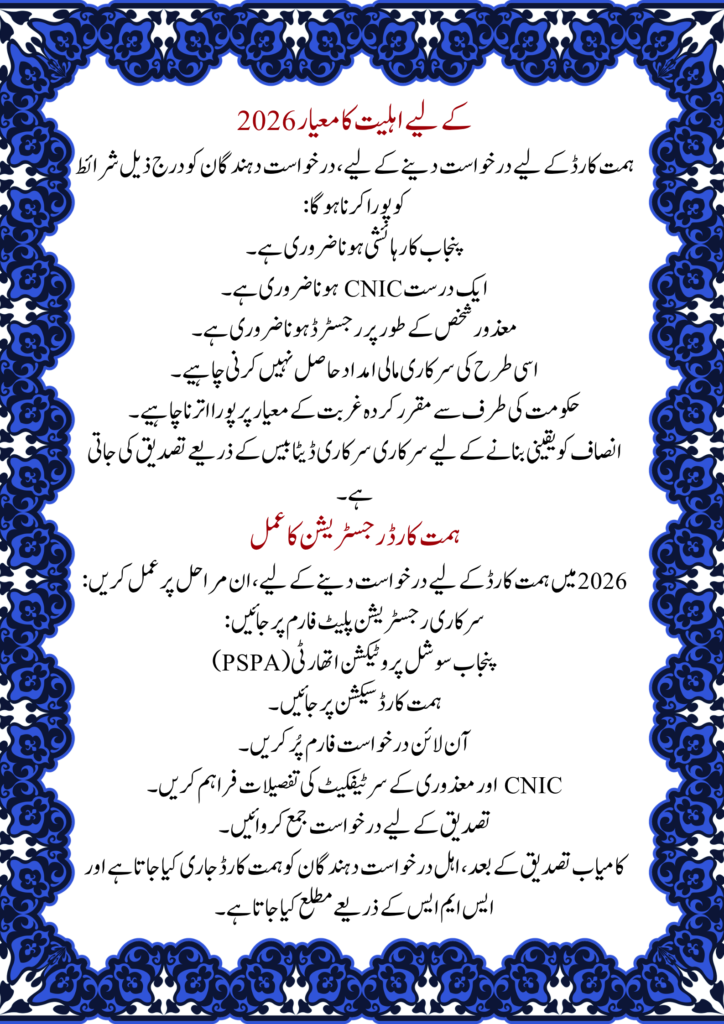 The Himmat Card Official Registration 2026 is an important welfare initiative by the Government of Punjab designed to support persons with disabilities (PWDs). Under this program, eligible individuals receive financial assistance through a special card system, helping them manage daily expenses and improve their quality of life.